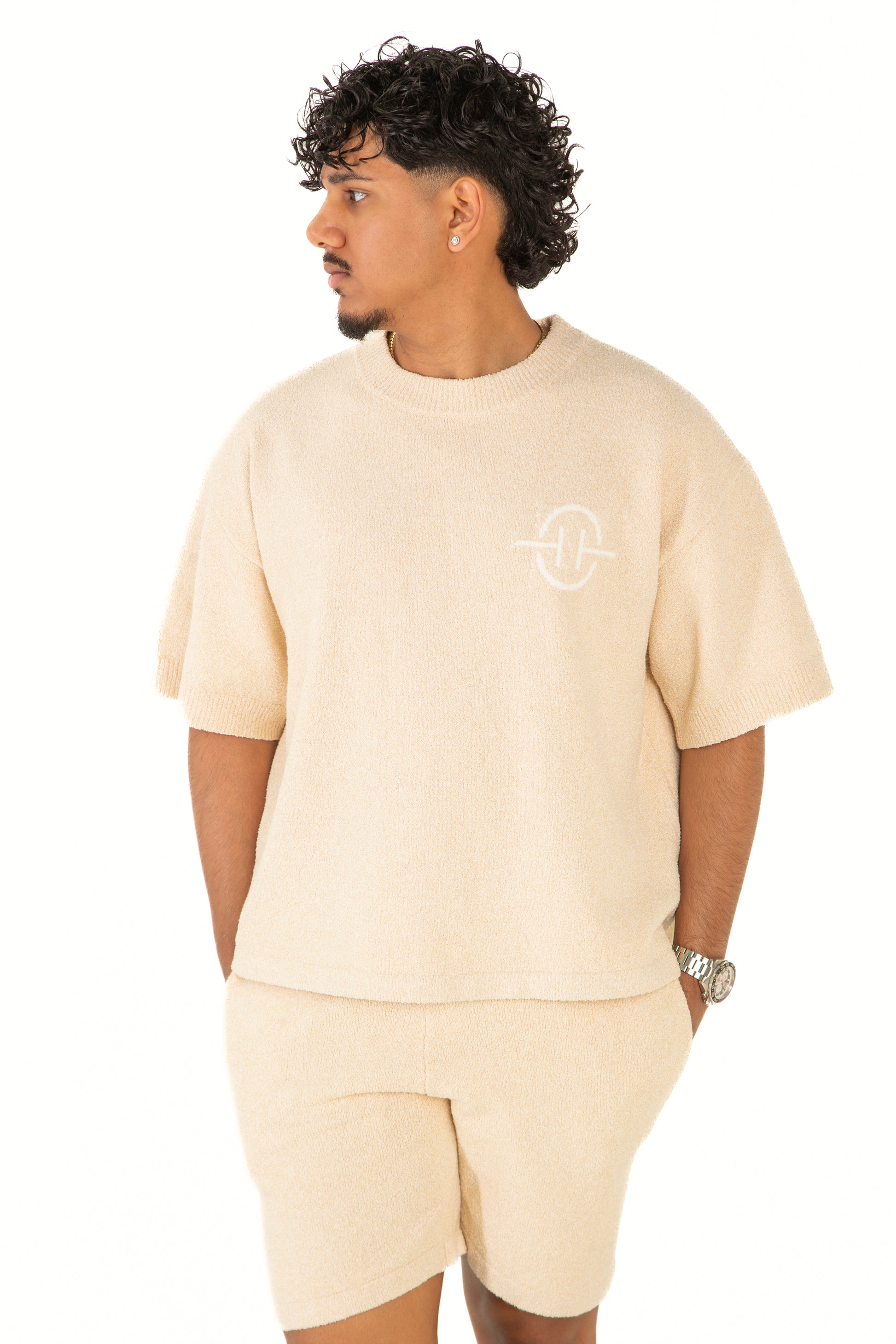 Our "Beige Sand" boxy fit t-shirt and shorts set in premium knit Fabric. The t-shirt features our signature "T+T" Logo on the left chest, dropped shoulders and cropped body designed to sit on the waist. It also features a metal logo at the back made from premium tarnish free material.